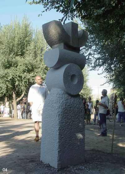 来自中国、俄国、波兰和意大利共8 位的艺术家,男女对半,搭配得很人性,而前几个创作营,不是只有我一位女士就是女士太少,意大利的创作营很人性,也很随便。它的条例严格,但实际操作却很自由,像此创作营就有一对夫妻带着三岁小女儿前来,象度假。我在撒丁岛完成作品后,也是无所顾忌地驱车遍岛游玩。虽然条例上写明每一天创作的必须起始时间。创作营照例设在大树成荫,环境幽美的教堂旁,煞是动人。由于这个创作营不像前几个是一单项的艺术活动,而是整个地区文化活动的一部分,因此格外热闹。开幕式上各式的民间歌舞表演,每晚的摇滚、现代流行歌曲演唱,传统的交际舞集合成一周满满的文艺欢乐秀场。让我们外来者赏尽了精彩,品足了风情,感透了热辣。一位英俊男士驱车送我们三位来自不同国度的女士回酒店,正常只是8 分钟车程,我们花费了2 小时半。其间他不停地邀我们去一个又一个酒吧品美酒,去朋友处造访。顺便说一句,这几个创作营的所在地均是意大利素有盛名的美酒产地。在这个创作营我选择了最粗的一根圆木,作了一件体量210×φ100cm,名为《那不能穿越的》的作品。每日陪伴大家的是创作营的主席Roberto 先生,包括凌晨的接机, 驱车观景和送别。