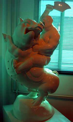——陈文令的雕塑是一种寓言性的社会表达,他主要是采用猪和快乐的市民形象,来寓言性的揭示中国社会正在不可避免地物质化和消费社会化,人们的价值观和自我灵魂正在进入一种物质社会的迷失之中。陈文令的雕塑在风格上还吸收了南方民间泥塑的表情和形体的夸张的语言形式——