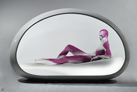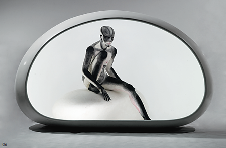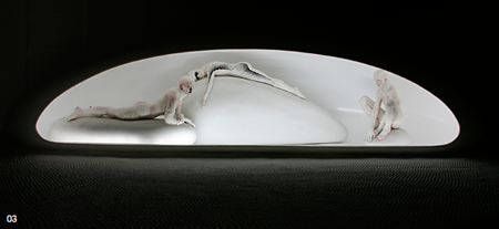 UNMASK的新作让我们的期待变得更加踏实了,这批新作品无论从艺术语言、观念还是制作工艺与技巧和视觉冲击上来说,都是UNMASK的一个突破,也是新观念雕塑的一个突破。这几件体积大却视觉上显得空灵的雕塑作品,仍然延续了UNMASK一直以来的对自我的诗意化描述和想象的母题。与上一批作品“半透明”不同的是,这一批作品非常“实在”,“实在”得纤毛毕现。UNMASK创造了一些类人的生物,它们有着人的基因和面貌,却异化成身上长出华丽而优雅的、白色、黄色、紫红色、黑色以及相间的美丽毛发,就像动物世界中美丽的动物皮毛斑纹一样。但从毛发的底层透出的粉红色肉色我们又能清楚地看到人的皮肤和气息。这些皮毛象征了在这个科技发达、经济发达的时代人的异化和自我保护,就像动物 的皮毛和色彩是动物用来在野外保暖以及保护、隐藏自己的保护色一样。巧合的是,今天国际上遇到了经济寒冬与这组作品中人物长上了厚厚的皮毛,正好相互映证了当今的人类是多么需要肉体和精 神的自我保护。在一个人们不知所措的年代,艺术家用自己的艺术想 象找到了一种心灵自我保护的形象。这既是一种艺术的想象,又是一种对现实的批判。让我们欣赏这些艺术品来得到心灵的抚慰吧。UNMASK创造那些似人非人的形象都有着美丽而安全的皮毛,却形单影只,忧郁而伤感,他们坐在纯白色的巨大光滑鹅卵石上,在白色的空洞之穴中,独自相处。就像这个时代的忧郁和孤独,让人很容 易想到自己在这个大时代的无助和迷茫。其中有一件作品是三个长着不同斑纹的白色皮毛的人以各种不同的姿态同处一个光滑白色洞穴之中,他们或蹲,或趴在白色巨大卵石上,就像某种动物在享受午后的阳光,在小憩。但与动物的神态不同的是,这三个人物都有着一种思考的表情、深沉的表情、智慧的表情。作品中隐喻着某种社会关系和人的生存状态。艺术家创造出非现实的自我,让人类无法解脱的困境和没有答案的思索在艺术的语境和想象中自我轮回和排解。这也是一种理想主义和对自我的深度放逐。